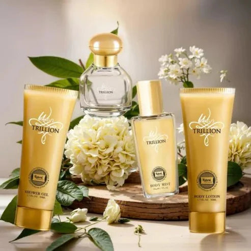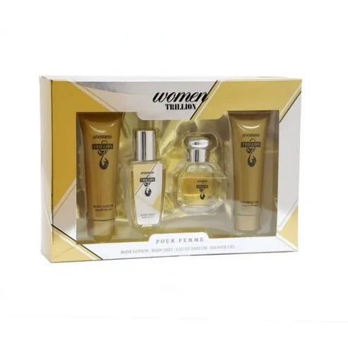 ✔ Includes 4 coordinated products – Body Lotion, Body Mist, Eau de Parfum, and Shower Gel – all in the "Trillion Women" scent.